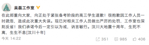 吴磊工做室微博发声明道歉:“正在此向大师,生生不息”。很抱愧因工做人员一时疏忽,汶川大地动十周年,生者顽强,愿将来一切安好”。